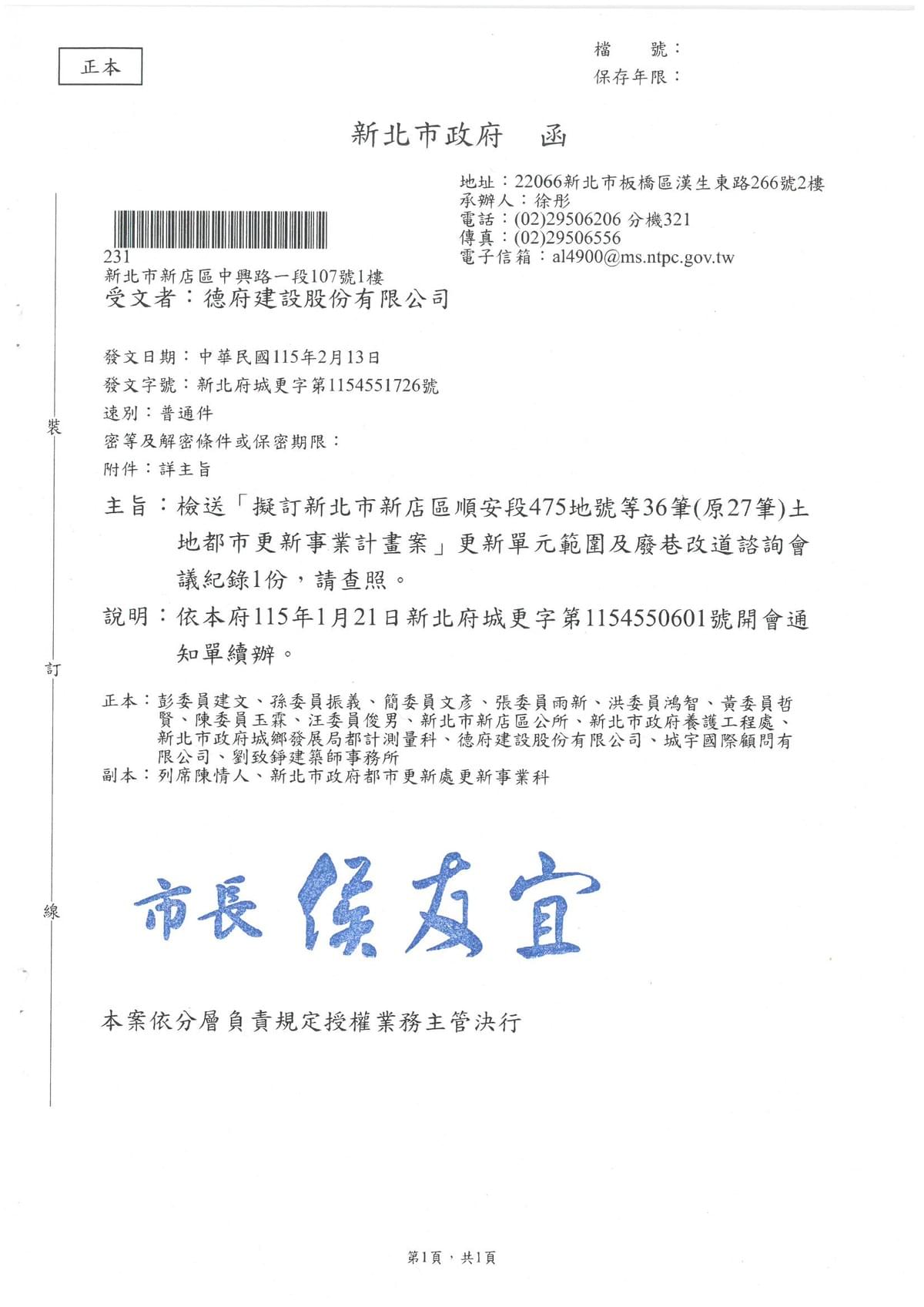 115.01.21新北市政府發函於115.01.29上午11時於新北市政府13樓1335會議室開會-關於更新範圍及廢巷改道諮詢會議.